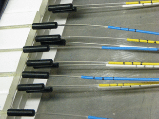 | Another view of the WLS fibers emerging from the scintillators. You can clearly see the three layers of scintillator and also the spacer at the left edge of the top and bottom layer. |