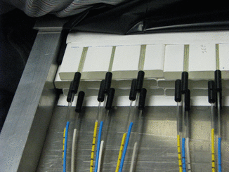 | Another view of the WLS fibers emerging from the scintillators. You can clearly see the three layers of scintillator. |